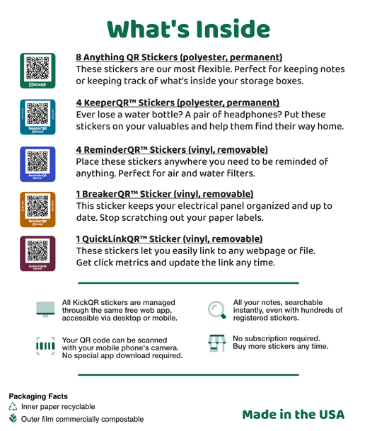 With smart QR codes for box & bin organization, lost & found, reminders, electrical panels, and more, KickQR is the most complete and advanced smart QR code system for organizing your home and life. See our selection of smart QR code stickers below or visit our Web App to learn more.